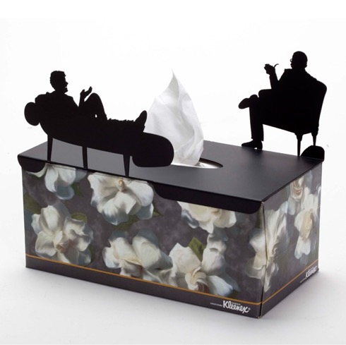 ティッシュボックスの上に乗せて使用するこちらのカバー。心理療法を受けている患者とセラピストのシルエットが、白いティッシュと良いコントラストを生み出しています。