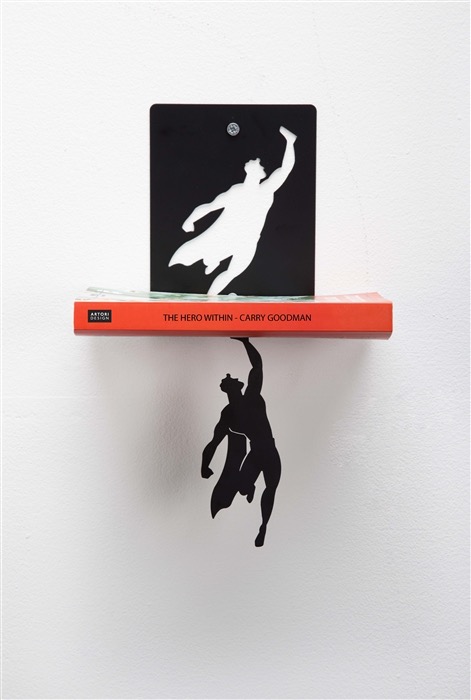 スーパーヒーローが倒れそうな本を支えているように見えるこちらのブックエンド。仕組みは別サイトでご紹介したことがある『コンシールブックシェルフ』と一緒ですね。