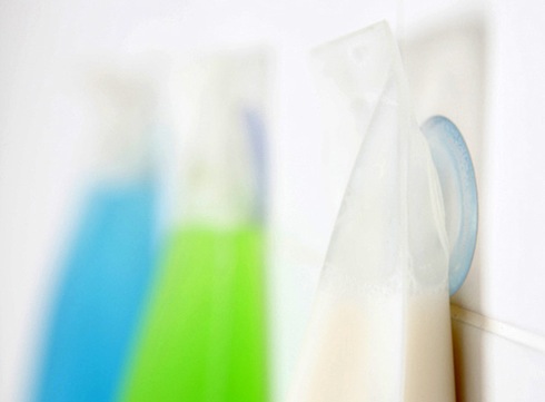 詰替用シャンプーのようなソフト素材で出来たこのパッケージ。実は、バスルームの壁にそのまま貼りつけてボトル代わりに使うことができます(パッケージの下に注ぎ口がついています)