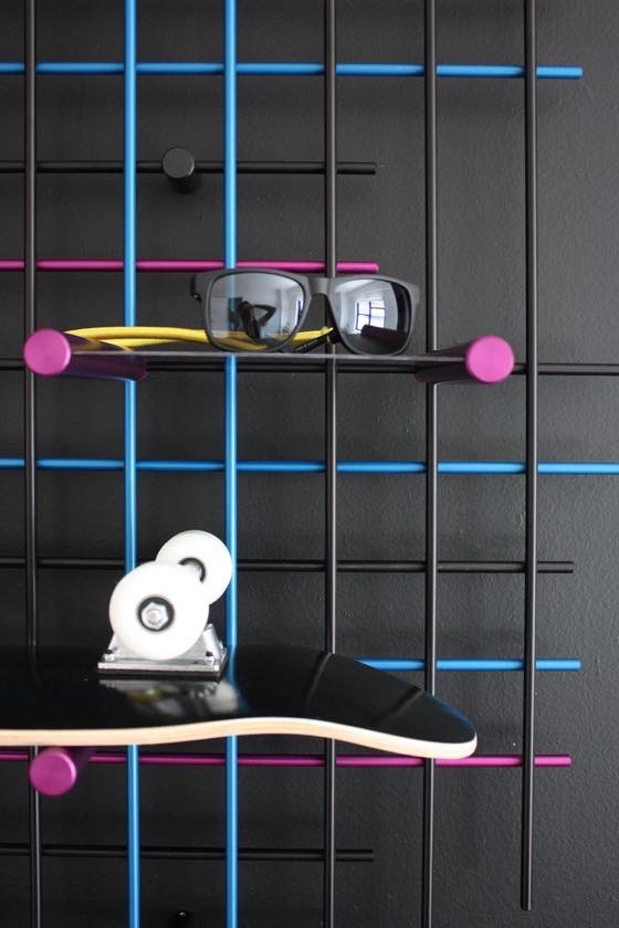 ブラック・ブルー・バイオレットの三色のアルミニウム棒を格子状に組み合わせて作られたこちらのオブジェ。取り外し可能なペグを利用することで、大きさも形も様々なスポーツグッズ(ギア)を壁に飾りながら収納することができます。