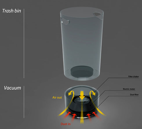 ゴミ箱と掃除機が合体したようなこのアイテム。ホウキなどでゴミ箱のまわりにゴミを集めてスイッチを入れれば、後はゴミ箱自身がゴミを吸い取ってくれるというワケです。