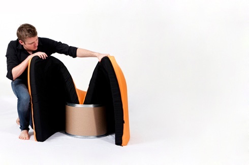 一見すると普通のシンプルなアームチェア。しかし、背面のファスナーを開けるとたちまち本体がベッドマットとスツール兼テーブルに早変わりしてしまいます。